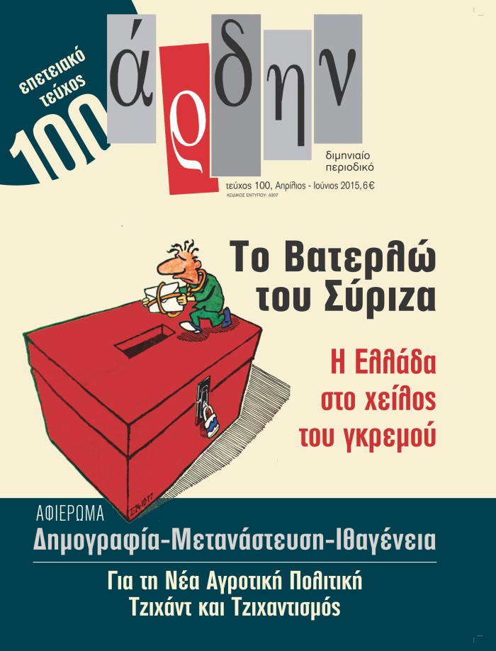 Στο Άρδην τ. 100 (επετειακό τεύχος) που κυκλοφορεί, ασχολούμαστε με το Βατερλώ του Σύριζα, πως μέσα σε έξι μήνες μετατράπηκε σε μνημονιακό κόμμα και έφερε στην χώρα ένα τρίτο πιο επώδυνο Μνημόνιο. Ο Γιώργος Καραμπελιάς γράφει για τη συμφωνία της 13ης Ιουλίου που οφείλει να αναγνωστεί ως μια ήττα του αντιμνημονιακού κόσμου, το ζητούμενο είναι να επικεντρωθούμε στις επόμενες μάχες. Δημοσιεύουμε τα βασικά σημεία της πανελλαδικής συζήτησης που παραγματοποίησε η Κίνηση Πολιτών Άρδην στις 20 Ιουνίου και που επικεντρώθηκε στην οικονομική κατάρρευση, το πολιτικό αδιέξοδο και τα παιχνίδια ψευδοεμφυλίου που στήνουν οι κυβερνώντες. Ο Γιώργος Καραμπελιάς με αφορμή ένα τρικάκι που μοίρασαν Αυτόνομοι στο Χαλάνδρι και είχε σύνθημα, “Να πεθάνει η Ελλάδα για να ζήσουμε εμείς” αναλύει τον εντεινόμενο κοινωνικό μηδενισμό, που είναι ιδιαίτερα ισχυρός στην νεολαία.