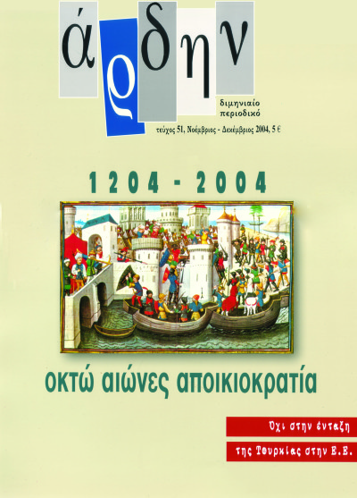 Το 51ο τεύχος του Άρδην είναι αφιερωμένο στους οκτώ αιώνες από την άλωση της Κωνσταντινούπολης από τους Σταυροφόρους (1204-2004). Παράλληλα αναφέρεται στην προοπτική ένταξης της Τουρκίας στην Ευρωπαϊκή Ένωση με τις ανυπολόγιστες συνέπειες που θα έχει αυτή τόσο για την χώρα μας, όσο και για την Ευρώπη–  στην πρόσφατη αναγνώριση των Σκοπίων ως «Μακεδονία» από τις Η.Π.Α., στην στρατηγική του Σαρόν, την ενεργειακή κρίση, τις εξελίξεις στο ΔΗΚΚΙ, τους διαπλεκόμενους «ðιανοουμένους» κ.λπ..